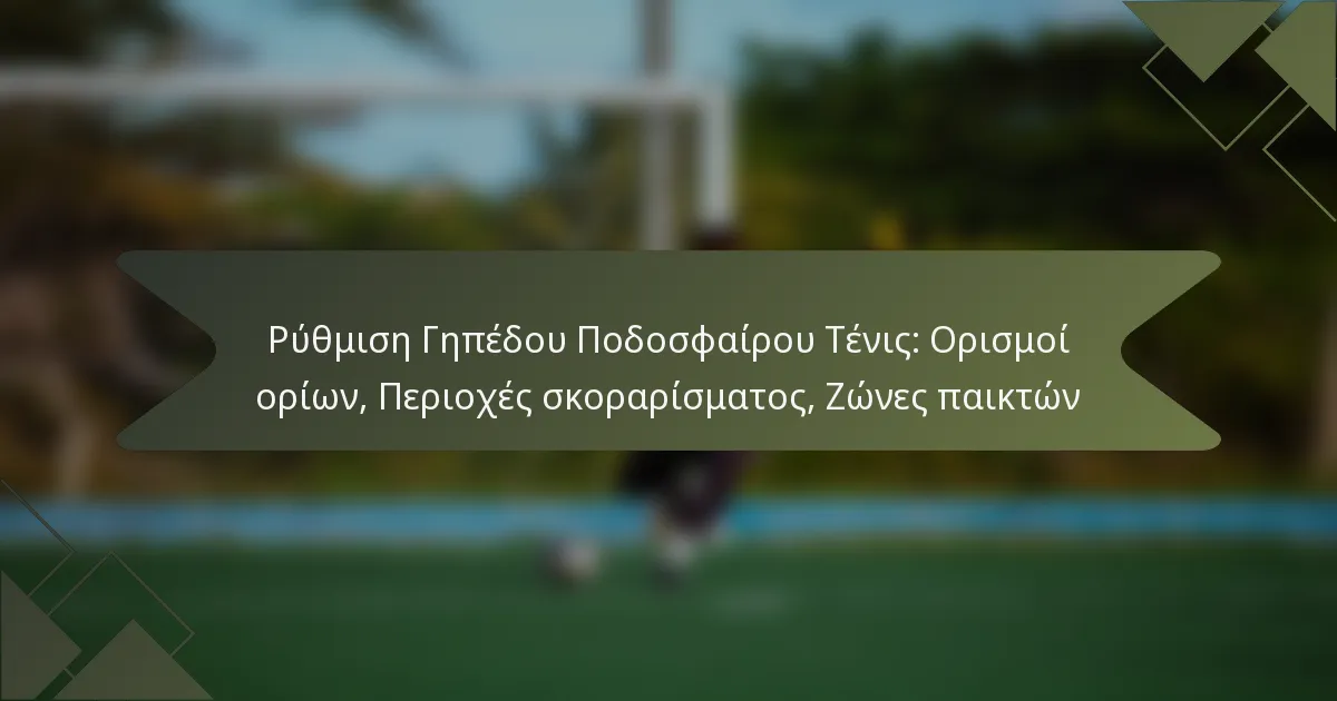 Η εγκατάσταση ενός γηπέδου ποδοσφαίρου τένις περιλαμβάνει ακριβείς ορισμούς ορίων που καθορίζουν την περιοχή παιχνιδιού και προάγουν το δίκαιο παιχνίδι. Κύρια στοιχεία περιλαμβάνουν καθορισμένες περιοχές σκοραρίσματος που επηρεάζουν τη συσσώρευση πόντων και συγκεκριμένες ζώνες παικτών που καθορίζουν τη θέση και την κίνηση των παικτών κατά τη διάρκεια των αγώνων. Η κατανόηση αυτών των στοιχείων είναι απαραίτητη για αποτελεσματικό παιχνίδι και ανάπτυξη στρατηγικής.