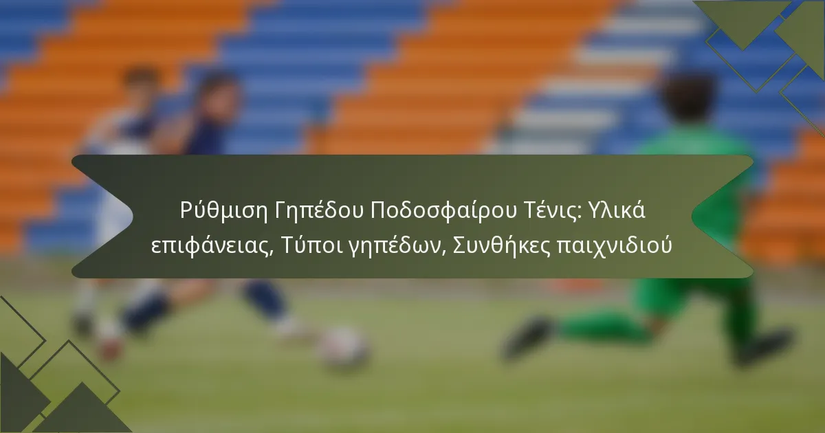 Τα απαραίτητα υλικά επιφάνειας για ένα γήπεδο ποδοσφαίρου τένις περιλαμβάνουν φυσικό χόρτο, τεχνητό χλοοτάπητα, πηλό και σκληρές επιφάνειες. Κάθε τύπος έχει διακριτά χαρακτηριστικά, απαιτήσεις συντήρησης και επιπτώσεις στην απόδοση που μπορούν να επηρεάσουν το παιχνίδι και την εμπειρία των παικτών.